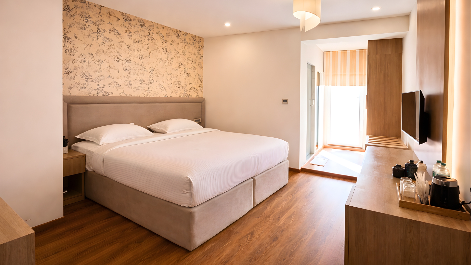 Designed with a minimal aesthetic and warm interiors, the room features comfortable bedding, smart lighting, and modern amenities that make everyday stays effortless. The uncluttered layout allows guests to unwind comfortably while still having the essentials needed for work or relaxation.